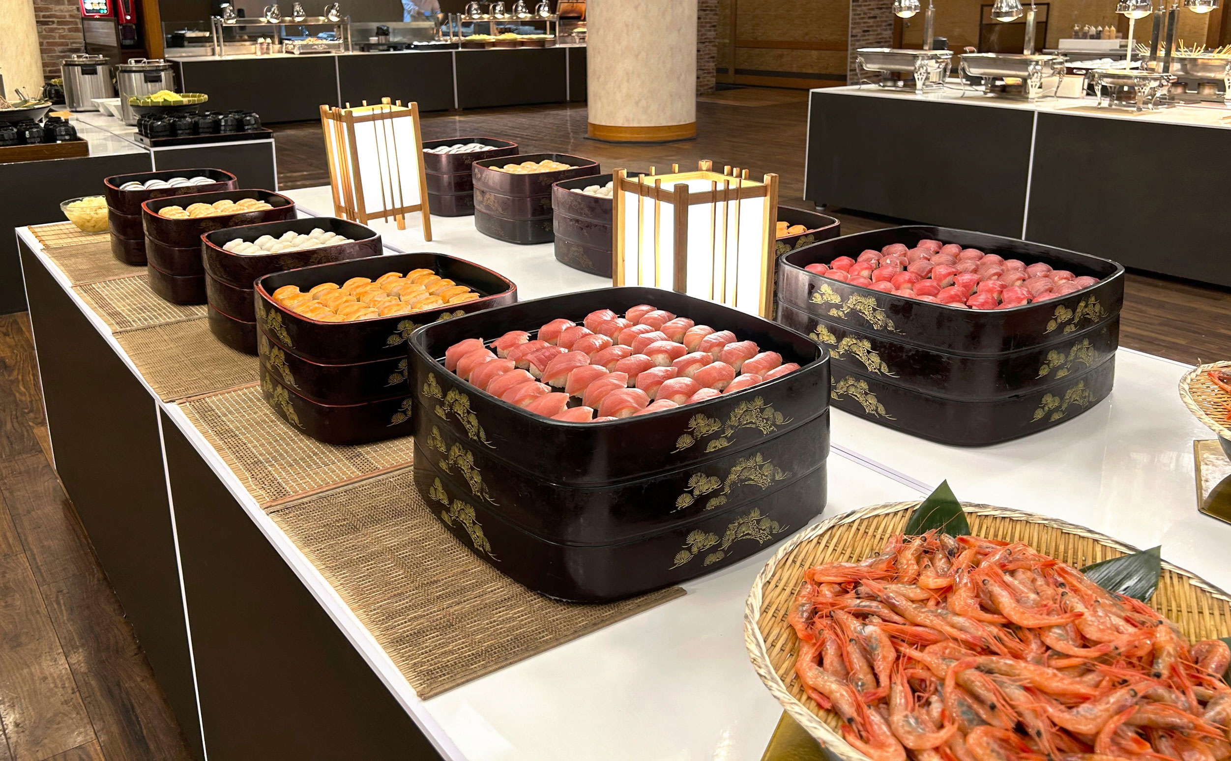 お食事は約80種類のバイキングと、約30種類のドリンクで、老若男女のみなさまお楽しみいただけます。